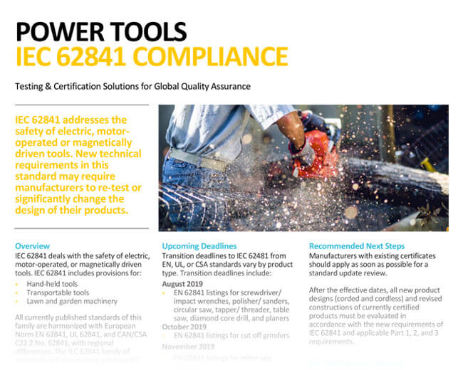 IEC 62841 addresses the safety of electric, motor-operated, or magnetically driven tools with provisions for hand-held tools, transportable tools, and lawn and garden machinery. Download our Fact Sheet for an Overview of IEC 62841.