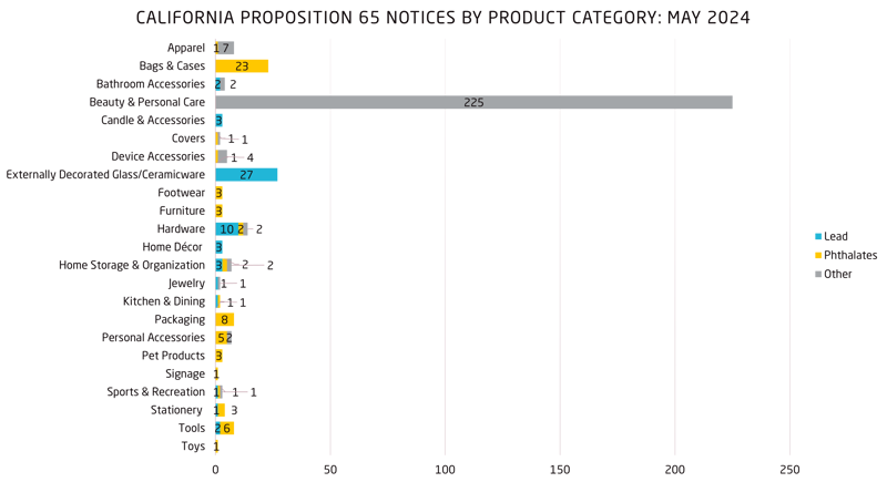 In May 2024, there were 539 60-day notices for violation of Prop 65, of which 33% of the notices served were for the category of Lead, 14% of notices were served for the presence of Phthalates, 53% of the notices were for the presence of Other chemicals.