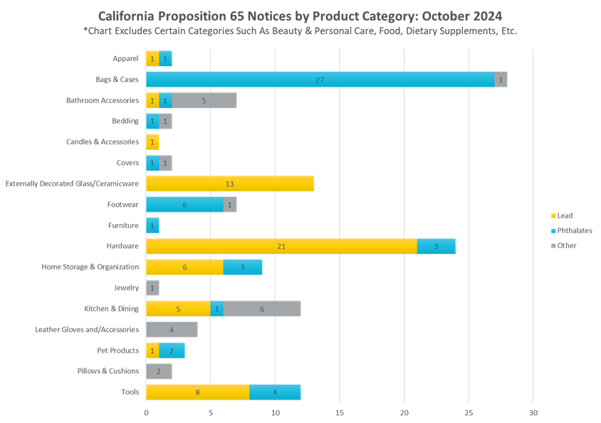 In October 2024, there were 498 60-day notices for violation of Prop 65, of which 43% of the notices served were for the category of Lead, 11% of notices were served for the presence of Phthalates, 46% of the notices were for the presence of Other chemicals.