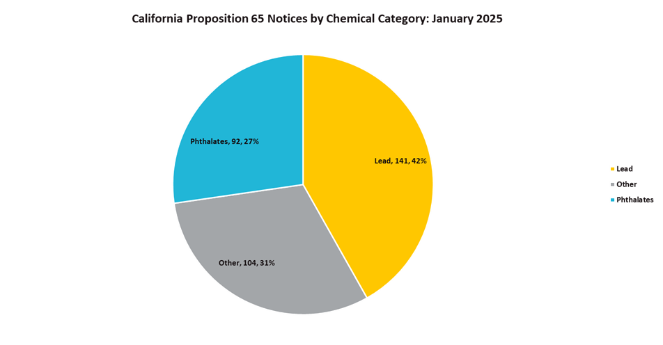 In January 2025, there were 337 60-day notices for violation of Prop 65, of which 42% of the notices served were for the category of Lead, 27% of notices were served for the presence of Phthalates, 31% of the notices were for the presence of other chemicals.